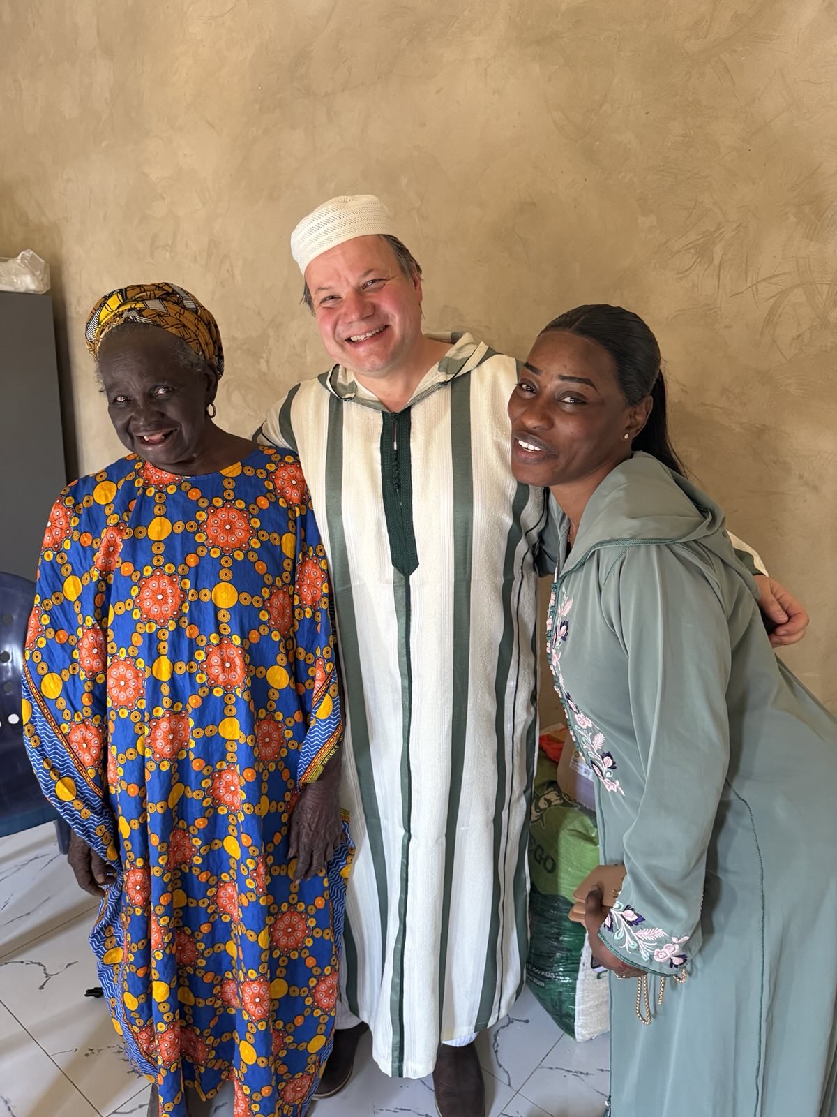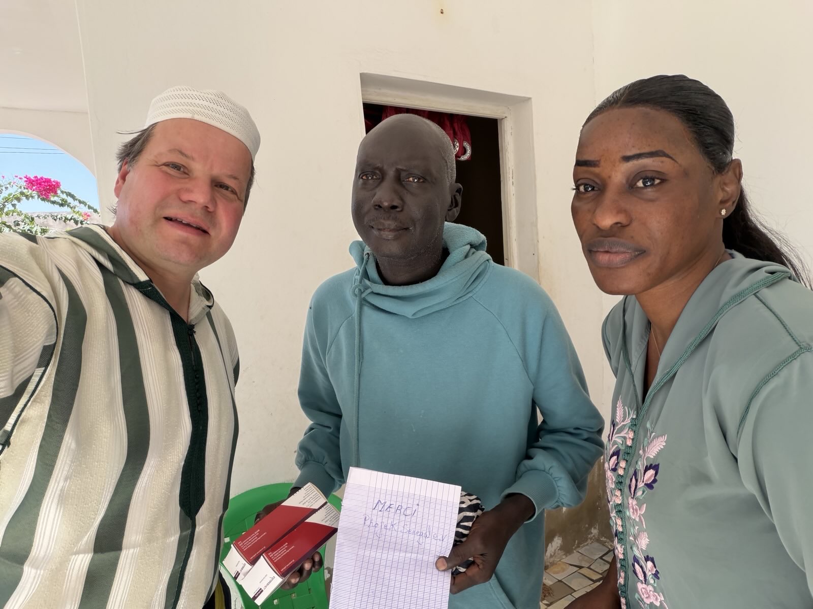 Einen älteren Mann hatten wir letztens schon eine Packung Medizin (Bluthochdruck) gespendet. Er hatte uns zuhause aufgesucht und inständig um Hilfe gebeten. Er ist schon um die 70, sehr krank und lebt alleine. Eine Kinder sind ausgewandert und leben in Paris, sind sehr selten zuhause und melden sich seit Wochen nicht. Der Mann selber kann sich die teuren Medikamente (19.800 CFA, ca. 30,50 Euro – reichen für einen Monat) nicht leisten (als Vergleich: eine Haushaltshilfe, die täglich arbeiten geht und für 4-5 Stunden in einem Haushalt hilft, verdient ca. 20.000 bis 25.000 CFA pro Monat). Diesem Mann haben wir auch besucht und neben o.g. Essen auch 2 weitere Packungen seiner benötigten Medikamente vorbeigebracht. Der Mann hat ebenfalls geweint und war sehr sehr gerührt und wahnsinnig dankbar. Diese beiden Medikamentenpackungen hat eine liebe Freundin gespendet und wir sie im Auftrag übergeben. Sehr sehr lieb und der Mann war sehr dankbar dafür.